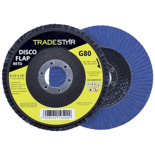 Principais Características do Produto 0 (bullet_point#0): Fabricado em material de alta qualidade e resistência | Principais Características do Produto 1 (bullet_point#1): Ideal para e doméstico | Principais Características do Produto 2 (bullet_point#2): Proporciona maior durabilidade e eficiência no trabalho | Baterias são necessárias? (batteries_required): Não | external_testing_certification:: CE | included_components: Disco Flap 115 mm G80 Fibra Reto Azul Aço e Inox Tradestar | manufacturer: Tradestar | number_of_items: | power_source_type: Manual | required_product_compliance_certificate: CE | unit_count: 1 | number_of_boxes: 1 | material : | model_number: | item_length_width_height: | part_number: | deprecated_offering_start_date : | is_expiration_dated_product: | warranty_description: | item_dimensions: | color: