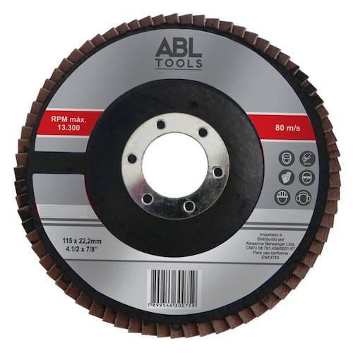 Disco Flap 115mm G40 - ABL Tools - Disco flap para desbaste e acabamento serviços leves . Características Gerais do Produto: Tamanho: 5X12X12cm 0,15Kg : 3 meses