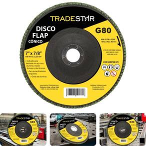 Principais Características do Produto 0 (bullet_point#0): Fabricado em material de alta qualidade e resistência | Principais Características do Produto 1 (bullet_point#1): Ideal para e doméstico | Principais Características do Produto 2 (bullet_point#2): Proporciona maior durabilidade e eficiência no trabalho | Baterias são necessárias? (batteries_required): Não | external_testing_certification:: CE | included_components: Disco Flap 180 mm G80 Fibra Cônico Aço Tradestar | manufacturer: Tradestar | number_of_items: | power_source_type: Manual | required_product_compliance_certificate: CE | unit_count: 1 | number_of_boxes: 1 | material : | model_number: | item_length_width_height: | part_number: | deprecated_offering_start_date : | is_expiration_dated_product: | warranty_description: | item_dimensions: | color: | Voltagem: Bivolt