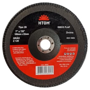 - Marca: HTOM - Referência: HTOM-40582 - Diâmetro externo: 7 Pol. 180mm - Diâmetro do furo: 7/8' - 22 mm - Tamanho do grão abrasivo: grão 120 - Material: Zircônia - Indicado para desbaste e acabamento em aço inox, alumínio, metais ferrosos e não ferrosos com esmerilhadeiras angulares - Permite atividades de desbaste e acabamento ao mesmo tempo, eliminando a troca de discos - Proporciona menor vibração e ruído comparado com o disco de desbaste convencional - Seu formato cônico permite um melhor aproveitamento do disco aumentando o rendimento - Tipo de costado: fibra - Tipo do perfil do disco de desbaste/acabamento flap-disc: cônico - Rotação máxima rpm : 13300 rpm - Velocidade periférica: 80 m/s - Norma de referência: Abnt Nbr 14960 - Peso bruto: 120 gramas