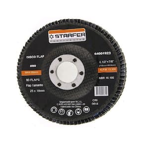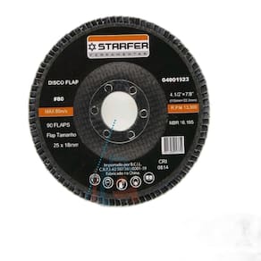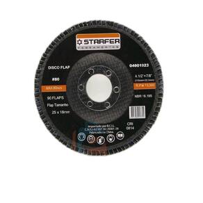 CARACTERÍSTICAS TÉCNICAS: Material: Feltro e fibra de vidro Medidas: 115mm - 4.1/2 diâmetro do disco x 22,23mm - 7/8 diâmetro do furo Limite máximo: 13.3000 rpm - 80m/s 90 Flaps - 25 x 18mm Grão: 80 Marca: Starfer Ref.: 4001834 Marca: Não Informado