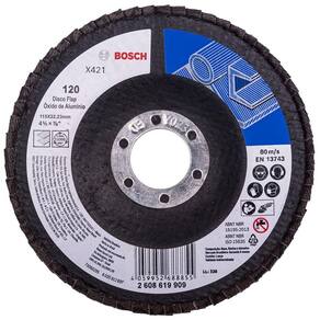 Disco Flap Bosch X421 óxido Alumínio de 115mm G60 - 2608619907 - Bosch Disco Flap Bosch X421 115mm G60 - 2608619907-000 - Bosch Disco Flap Bosch X421 Óxido Alumínio de 115mm G60 - 2608619907 - BOSCH Descrição: Alta taxa de remoção de material e bom acabamento A lixa de óxido de alumínio é robusta e resistente ao desgaste. Ela ajuda você a obter um acabamento consistente. A placa de apoio é feita em fibra de vidro.