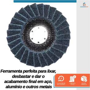 Características: Desempenho: As 28 abas abrasivas sobrepostas flaps de 28 mm x 17 mm garantem um lixamento uniforme e rápido, removendo rebarbas e imperfeições com facilidade. Precisão: A manta fina azul proporciona um acabamento mais preciso, ideal para detalhes e superfícies irregulares. Durabilidade: Construído para durar, o disco possui alta resistência e pode ser utilizado em alta rotação até 12200 rpm . Versatilidade: Perfeito para uma variedade de aplicações, desde o desbaste inicial até o acabamento final.