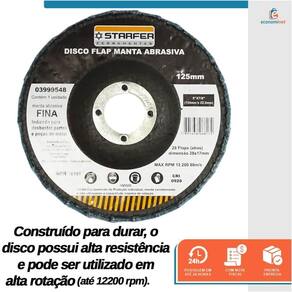 Especificações técnicas: Material: Fibra, tecido sintético e óxido de alumínio Diâmetro: 5 125 mm Furo: 7/8 22,23 mm Manta: Fina azul Abas: 28 Tamanho das abas: 28 mm x 17 mm Rotação máxima: 12200 rpm Velocidade linear máxima: 80 m/s Quantidade: 1 unidade Ref.: 3999548 Marca: Starfer Marca: Não Informado