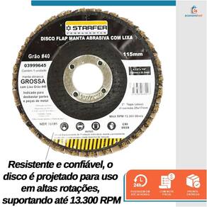 Especificações Técnicas: Material: Fibra, tecido sintético e óxido de alumínio Diâmetro: 4.1/2" (115 mm) Furo: 7/8" (22,23 mm) Manta: Grossa (amarela) Grão #40 Abas: 28 (25 mm x 17 mm cada) Rotação máxima: 13.300 RPM Velocidade linear máxima: 80 m/s Quantidade: 1 unidade Referência: 3999645 Marca: Starfer