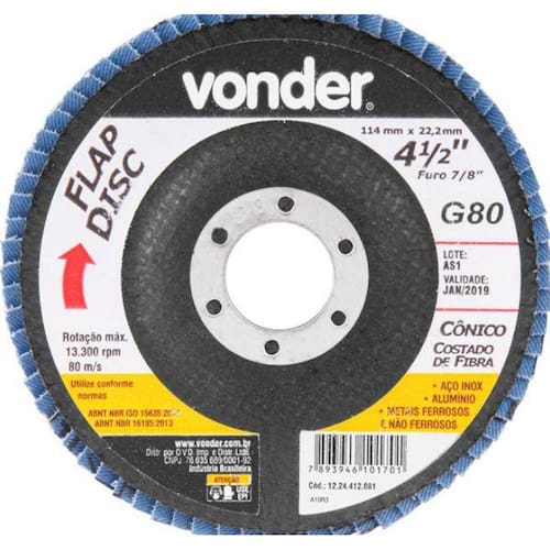 Conteúdo da Embalagem: 1 Disco de desbaste/acabamento flap-disc Indicado para desbaste e acabamento em aço inox, alumínio, metais ferrosos e não ferrosos com esmerilhadeiras angulares. Permite atividades de desbaste e acabamento ao mesmo tempo, eliminando a troca de discos. Proporciona menor vibração e ruído comparado com o disco de desbaste convencional. Seu formato cônico permite um melhor aproveitamento do disco aumentando o rendimento. Diâmetro externo do disco de desbaste/ acabamento flap-disc:4.1/2 - 115 mm Diâmetro do furo do disco de desbaste/ acabamento flap-disc:7/8 - 22,23 mm Grão:g 80 Tipo de costado:Fibra Tipo do perfil do disco de desbaste/acabamento flap-disc:Cônico Tipo do grão abrasivo:Óxido de zircônio Rotação máxima rpm :13300 /min Velocidade periférica máx. :80 m/s Norma de referência:ABNT NBR ISO 15635 / ABNT NBR 16195 - E CDC : legal: 90 dias
