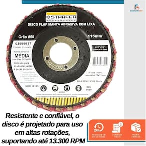 Especificações Técnicas: Material: Fibra, tecido sintético e óxido de alumínio Diâmetro: 4.1/2 115 mm Furo: 7/8 22,23 mm Manta: Média vermelha Grão 60 Abas: 28 25 mm x 17 mm cada Rotação máxima: 13.300 RPM Velocidade linear máxima: 80 m/s Quantidade: 1 unidade Referência: 3999637 Marca: Starfer