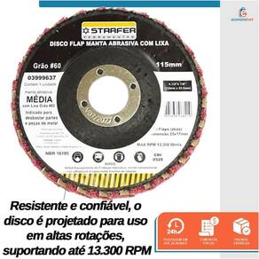 Especificações Técnicas: Material: Fibra, tecido sintético e óxido de alumínio Diâmetro: 4.1/2 115 mm Furo: 7/8 22,23 mm Manta: Média vermelha Grão 60 Abas: 28 25 mm x 17 mm cada Rotação máxima: 13.300 RPM Velocidade linear máxima: 80 m/s Quantidade: 1 unidade Referência: 3999637 Marca: Starfer