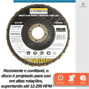 Especificações Técnicas: Material: Fibra, tecido sintético e óxido de alumínio Diâmetro: 5 125 mm Furo: 7/8 22,23 mm Manta: Grossa amarela Grão 40 Abas: 28 28 mm x 17 mm cada Rotação máxima: 12.200 RPM Velocidade linear máxima: 80 m/s Quantidade: 1 unidade Referência: 3999688 Marca: Starfer