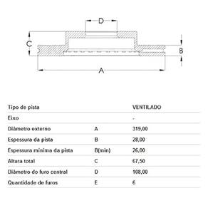 CARACTERÍSTICAS: Dianteiro Sem Cubo Diâmetro externo A 319,00 Espessura da pista B 28,00 Espessura miníma da pista TH(min) 26,00 Altura Total C 67,50 Diâmetro do furo central 108,00 Quantidade de furos E 6