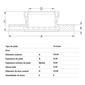 CARACTERÍSTICAS: Traseiro Ventilado Sem Cubo Diâmetro externo A 335,00 Espessura da pista B 34,00 Espessura mínima da pista TH(min) 32,00 Altura total C 111,00 Diâmetro do furo central D 152,00 Quantidade de furos E 8