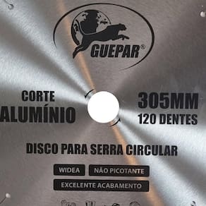 Disco Lâmina De Serra Circular 305Mm Para Alumínio 120 Dentes Disco Lâmina de Serra 305mm Wídea para Alumínio 120 Dentes Profissional Guepar A Lâmina de Serra Circular 12 Pol. 305mm da Guepar é ideal para cortes em alumínio, produzindo encaixes perfeitos. Fabricada com 120 dentes de vídea finos que reduzem estilhaços e lascas - Marca: Guepar - Modelo: 861-02025 - Aplicação: Alumínio e Madeira Laminada - Diâmetro: 12 polegadas 305mm - Dentes: 120 dentes - Furo: 30mm - Acompanha anel de redução para 1 Pol. 25mm e 16mm - Indicado para serras circulares de qualquer marca - Dentes de wídea, acabamento excepcionalmente liso - Lâmina de aço temperado e endurecido - Cortes precisos produzindo encaixes perfeitos - Dentes finos, reduzem estilhaços e oferecem facilidade no corte - : 90 dias contra defeitos de fabricação