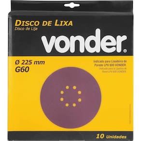 Aplicação: Ideal para lixar paredes de alvenaria, gesso e massa corrida. Indicado para as lixadeiras LPV 400B, LPV 600, LPV 925, LPV 950B e LPV 1000 VONDER e também outras marcas, desde que o diâmetro e a furação sejam compatíveis.