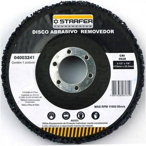 Disco Removedor Polidor 4.1/2 Starfer Disco removedor abrasivo para desbaste em metais, em formato circular disco com as seguintes dimensões: Diâmetro do disco: 4.1/2 115mm Diâmetro do furo: 7/8 22,23mm Composição: Grão abrasivo em nylon e resinaDisco em fibra de vidroPerfil do disco com depressão central Para uso em esmerilhadeiraLimite máximo: 1100rpm, 80m/s Ref.: 4003241Marca: Starfer