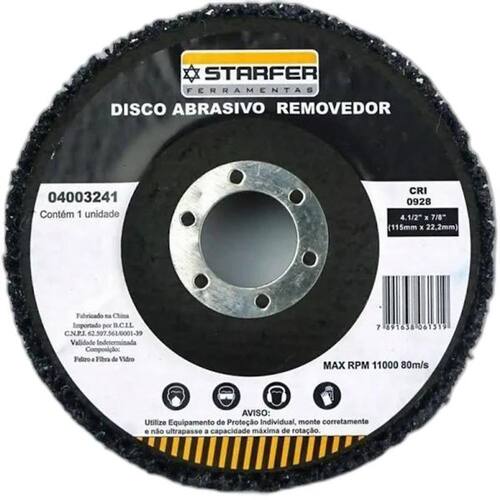 Disco Removedor Polidor 4.1/2 Starfer Disco Removedor Polidor 4.1/2 Starfer Disco removedor abrasivo para desbaste em metais, em formato circular disco com as seguintes dimensões: Diâmetro do disco: 4.1/2 115mm Diâmetro do furo: 7/8 22,23mm Composição: Grão abrasivo em nylon e resinaDisco em fibra de vidroPerfil do disco com depressão central Para uso em esmerilhadeiraLimite máximo: 1100rpm, 80m/s Ref.: 4003241Marca: Starfer Marca: Não Informado