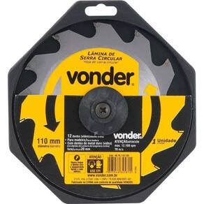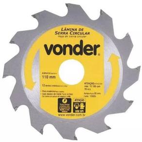Disco Serra Circular 12 Dentes 110mm Vonder Peso: 0.12 Kg Conteúdo da Embalagem: 1 Lâmina de serra circular Indicada para cortar madeiras e derivados. Nunca exceder a rotação máxima rpm - risco de acidente e/ou queima da lâmina. Não cortar madeiras impregnadas com massa ou cimento. Corpo em aço carbono com dentes de metal duro/vídea que proporcionam maior vida útil Especificações Técnicas: Diâmetro da lâmina de serra circular: 4.3/8 - 110 mm Número de dentes da lâmina de serra circular: 12 dentes Espessura de corte da lâmina de serra circular: 2,6 mm Espessura do corpo da lâmina de serra circular: 1,5 mm Diâmetro do furo da lâmina de serra circular: 20 mm Rotação máxima da serra circular: 12.100 rpm Velocidade periférica: 70 m/s Tamanho da bucha de redução : De 20 para 16 mm Marca: Não Informado Ean: 7893946345815