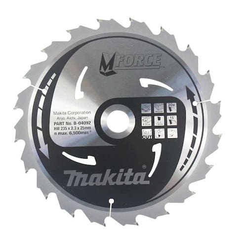 Marca: Makita Referência: B-04092 Linha: MForce Diâmetro: 235mm Furo: 25mm Espessura do dente: 2,3mm Número de dentes: 20 Ângulo do gancho: 15 Corte agressivo com excelente acabamento Aplicação em madeira Dente especial com duas arestas cortante garante melhor acabamento Dentes com grãos de tungstênio de alta qualidade Desenho anti contra-golpe Alma do disco termicamente tratada Saídas para refrigeração Aberturas de expansão Uso na serra circular 5902B Makita ou similares Peso bruto: 600 gramas