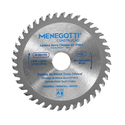 Especificações: Marca: Menegotti Modelo: MSC 110mm 40D Diametro dos furos: 20mm Diâmetro do disco: 4.3/8" - 110mm Número de dentes: 40 Rotação máxima: 13.000 rpm