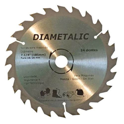Um disco de serra para madeira é uma ferramenta de corte projetada especificamente para cortar diferentes tipos de madeira. Este tipo de disco é comumente utilizado em serras circulares elétricas, serras de mesa e outras ferramentas elétricas para realizar cortes precisos e eficientes em madeira. Informações técnicas: perfil do corte: serra tipo de corte: a seco quantidade de dentes: 24 diâmetro externo: 180mm 7. 1/4'' diâmetro do furo: 20 mm rotação máxima por minuto: 15000 para corte de madeira proporciona qualidade e produtividade na operação produto de altíssima qualidade com alta performance Marca: Diametalic