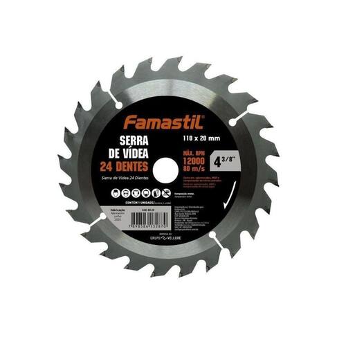 O Disco de serra de vídea para madeira 110 x 20 mm 24 dentes da Famastil é composto por um aglomerado de carbonetos de metais raros resistentes ao desgaste e possui dentes de vídea, garantindo menor ruído e vibrações. Tem RPM máximo de 80m/s. O disco de serra famastil é indicado para corte em madeira e MDF.