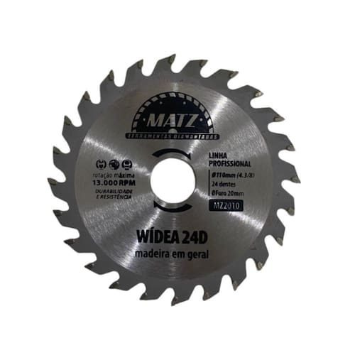 Informações técnicas: Perfil do corte: Serra Tipo de corte: A seco e refrigerado Dimensões: - Diâmetro externo: 110mm 4.3/8'' - Diâmetro do furo: 20mm - Espessura: 2mm Quantidade de dentes: 24 Rotação máxima por minuto RPM : 13.000 - 80m/s Para corte de: Madeira em geral Proporciona qualidade e produtividade na operação Produto de altíssima qualidade com alta performance