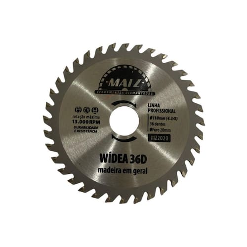 Informações técnicas: Perfil do corte: Serra Tipo de corte: A seco e refrigerado Dimensões: - Diâmetro externo: 110mm 4.3/8'' - Diâmetro do furo: 20mm - Espessura: 2mm Quantidade de dentes: 36 Rotação máxima por minuto RPM : 13.000 - 80m/s Para corte de: Madeira em geral Proporciona qualidade e produtividade na operação Produto de altíssima qualidade com alta performance