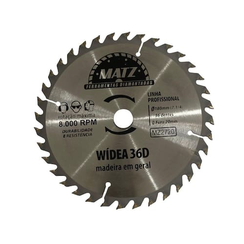 Informações técnicas: Perfil do corte: Serra Tipo de corte: A seco e refrigerado Dimensões: - Diâmetro externo: 180mm 7.1/4'' - Diâmetro do furo: 20mm - Espessura: 2mm Quantidade de dentes: 36 Rotação máxima por minuto RPM : 8.000 - 80m/s Para corte de: Madeira em geral Proporciona qualidade e produtividade na operação Produto de altíssima qualidade com alta performance Marca: Não Informado