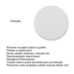 R: Escreva no disco de papel o seu pedido, nome, endereço, intenção, entre outras informações relevantes. Em seguida, utilize o Desimpregnador para limpá-lo, o Decágono para potencializar a energia e coloque-o sobre a placa escolhida. Por fim, direcione-o para o norte verdadeiro com a bússola Master Chi.