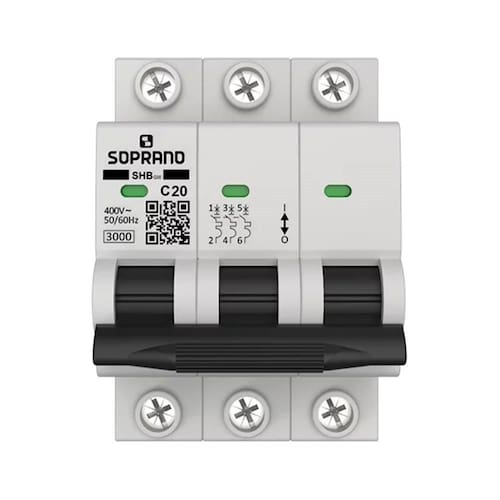 Características Principais: Marca: Soprano Modelo: 3kA Composição: Termoplástico e elementos metálicos Número de polos: 3 Corrente Nominal (In): 20A Classe de Proteção: classe 1 Tensão de Operação Nominal (Ue): 230/400Vca Curva de disparo termomagnética: tipo C - (5 a 10) x In EAN: 7891154189993