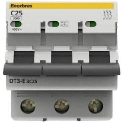 Disjuntor Termomagnético Tripolar Enerbras - 25 A Disjuntor termomagnético mais segurança para o seu maior patrimônio. Os disjuntores termomagnéticos da enerbras foram desenvolvidos para a proteção de instalações elétricas contra sobrecarga e curto-circuito. São equipados com sistemas de desarme através de disparadores térmicos para a proteção contra sobrecarga e magnéticos para a proteção contra curto-circuito, atuando com extrema agilidade e precisão. Possuem mecanismo de “disparo livre” garantindo o desarme do mecanismo mesmo que a alavanca de acionamento esteja travada na posição "ligado". Contatos especiais com camada de prata garantem a segurança contra soldagem em caso de curto-circuito. Possuem câmara de extinção de arco para absorver Energia do arco elétrico formado durante o curto-circuito, extinguindo-o imediatamente.
