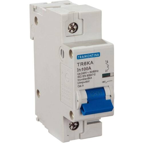 O Disjuntor TR6KA 1 P 100 A Curva C Tramontina é um item indispensável para garantir projetos elétricos funcionais e de alta qualidade. Desenvolvido para garantir a segurança da instalação, ele preserva a rede elétrica e seus equipamentos em caso de sobrecarga ou curto-circuito. Ele é instalado no quadro de distribuição e dimensionado de acordo com a potência dos equipamentos, números de tomadas e quantidade de lâmpadas. Sua montagem é individual, sem a necessidade de desmontar o barramento, o que otimiza o tempo de instalação. Além disso, possui indicador de liga e desliga que informa o seu status de funcionamento caso a manopla esteja travada. Um item com a qualidade Tramontina, que você já conhece e confia! Orientações . Características Gerais EAN13 7891435094480 DUN14 17891435094487 NCM 8536.20.00 Peso Líquido 0,1580 kg. Peso Bruto 0,1670 kg. Metragem 0,000165 m³. Dimensões Embalagem (Compr. X Larg. X Alt.) 85x 27x 72 mm. Dimensões Produto (Compr. X Larg. X Alt.) 85x 27x 74 mm. Observações A instalação e segurança: É importante que o produto seja instalado por profissional habilitado. Antes de instalar, desligue a energia elétrica.