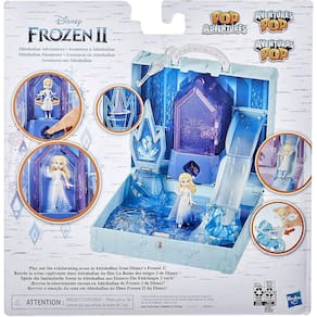 Inspirados nas aventuras épicas em Frozen 2, da Disney, os brinquedos Pop Adventures oferecem uma experiência emocionante. As crianças vão se deliciar em abrir o caso e assistir uma cena icônica aparecer bem diante de seus olhos! O playset Ahtohallan Adventures inclui 2 bonecas Elsa diferentes, uma boneca Water Nokk, e características divertidas como um slide e espelho reflexivo girando. As crianças podem jogar fora a cena emocionante em Ahtohallan de Frozen 2 da Disney quando colocam as duas bonecas Elsa na base, apertam o botão, e vêem-na mudar de um olhar de boneca para o outro!