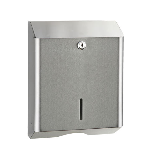 Com chave, seu design elegante e sóbrio, é ideal para uso em locais públicos, fabricado em aço inox acabamento escovado, de grande durabilidade. Possui capacidade para diferentes medidas de toalhas de papel. Com visor de nível de papel, permite visualizar quando o papel já está acabando.