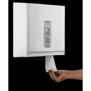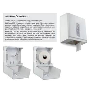 Instalação: pressione o botão para abrir. Abra com cuidado, puxando a parte frontal para a frente e para baixo. Fixe o dispensador na parede utilizando os parafusos que o acompanham. Abasteça com papel interfolhas, feche o dispensador e pronto