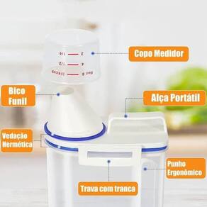 Especificação: - Material: Plástico e Silicone - Medida: 21cm x 09cm x 15cm - Hermético - Capacidade: 1,5 Kilos - Com Alça - Tampa com Dosador e Medidas - Peso: 180 gramas ===================================== Devido à diferença entre monitores e iluminação diferentes, pode haver variação na tonalidade apresentada no anúncio. Medidas muito aproximadas. Marca: Não Informado