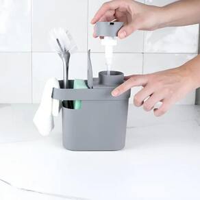 Além do reservatório com capacidade de 650ml para detergente, o produto conta com espaço para esponja e outros pequenos itens de limpeza, mantendo tudo sempre à mão e livre de bagunça. Sua bomba dosadora proporciona uso prático e econômico, evitando desperdícios e mantendo a pia sempre organizada.