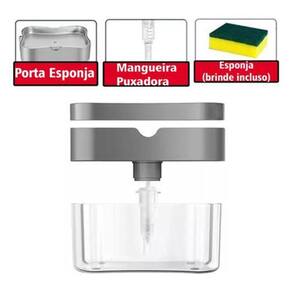 Dispenser 2 em 1 com porta-esponja, ideal para cozinhas domésticas, restaurantes e hotéis. Possui dosador por pressão para evitar desperdício de detergente e mantém a esponja seca.