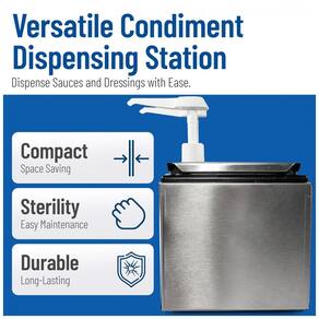 Porções ajustáveis que variam de 14,8 ml, 29,6 ml e 37,1 ml facilitam o descarte da quantidade perfeita de condimentos e coberturas todas as vezes. Frascos separados permitem a utilização de uma variedade de condimentos diferentes, tornando o um complemento versátil para qualquer estabelecimento de cozinha ou serviço de alimentação. O estudo e a construção durável em aço inoxidável garantem que ele possa suportar o desgaste das cozinhas mais movimentadas. Os pés de borracha antiderrapante mantêm o trilho de cobertura firmemente no lugar durante o uso, reduzindo o risco de derramamentos e bagunças. Seu design clássico o torna uma adição elegante e complementar a qualquer estabelecimento de serviço de alimentação, de cafés casuais a restaurantes requintados. Ideal para dispensar eficientemente condimentos, curativos e molhos. Bombas ajustam se a 14,8 ml ou 29,6 ml por curso para controle máximo da porção. Cobertura inoxidável para estética e máxima durabilidade. Os pés de borracha evitam deslizar. Inclui bombas ajustáveis 2 e frascos de 2 2,5 litros Marca: Não Informado