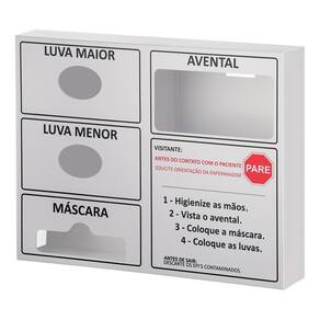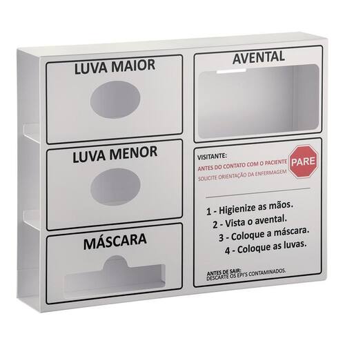 Modelo exclusivo de encaixe de embalagem de luvas, máscaras e aventais. Use diretamente no suporte. Possibilidade de fabricação de modelos de Dispensers personalizados. Acompanha kit para fixação na parede, contendo: bucha, parafuso e fita dupla-face. Indicados para armazenar Equipamentos de proteção individual de uso único.