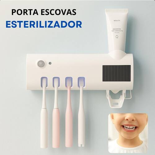 Dispenser esterilizador de escovas usb Descrição do anúncio: O porta escova de dentes suporte de pasta automático e esterilizador uv da solar é uma solução avançada para manter suas escovas de dente livres de bactérias. Utiliza tecnologia uv e fotocatalisador, eliminando 99,9% dos micro-organismos. Com carregamento solar e por usb, seu sistema de bomba de vácuo evita desperdício de pasta de dente.