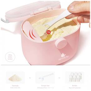 O Dispenser Fórmula Bebê Termichy é um recipiente portátil para armazenar e dosar leite em pó ou lanches para bebês durante viagens ou atividades ao ar livre. Fabricado em PP plástico grau alimentício sem BPA, lavável em lava-louças, cada unidade possui capacidade de 250g ou 500ml e alça para transporte, com design separado para colher e fórmula visando higiene.
