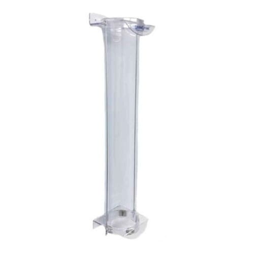 Dispenser de copos para café de 50ml capacidade para 125 copos aproximadamente. Tubo confeccionado em pvc semi rígido, base superior e inferior injetado em plástico abs cristal fumê.