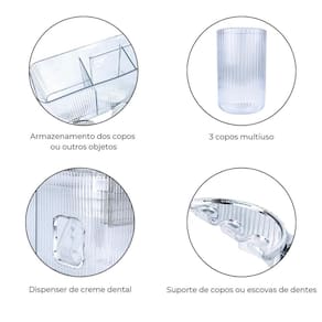 O organizador multiuso perfeito para o seu banheiro Composto por um dispenser de pasta de dente, onde é possível encaixar a a pasta e apertar com a própria escova de dente em uma abertura de clique do dispenser e assim despejar a quantidade de pasta que preferir. Composto por 3 copos acrílicos multiuso, que podem ser utilizados para enxaguar a boca, serem porta objetos da pia, organizadores e muito mais O organizador possui 3 aberturas, ou para os copos ou para cosméticos e itens em geral, abaixo do organizado são encaixados três ganchos prateados para colocar os copos, ou para organizar escovas de dentes, acompanha um adesivo de fácil aplicação na parte de trás do produto, para que seja colado na parede, feito de alta qualidade, não permite que o organizador se descole. Sei design é neutro, feito de acrílico transparente com alguns detalhes em relevo e detalhes prateados em plástico.