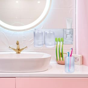 Características principais: - dispenser de pasta de dentes em clique; - 3 ganchos que suportam 3 escovas ou 1 copo cada; - design elegante; - acrílico de alta qualidade; - resistente; - acompanha adesivo; - multiuso; - 3 copos acrílicos; - espaço para armazenamento de outros objetos no organizador; - compacto.