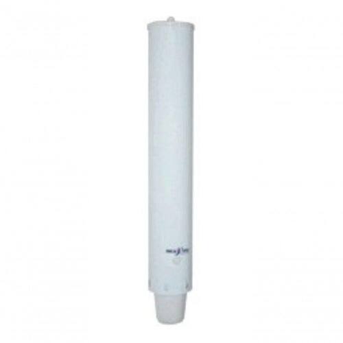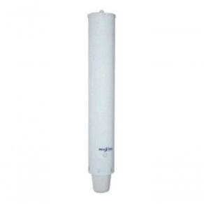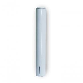 Dispenser cilíndrico para copos descartáveis de plástico, com capacidade para 100 unidades. Construído em aço carbono, com acabamento em pintura epóxi branca.