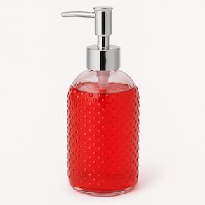 Fabricado em vidro resistente, o dispenser possui um design sofisticado com textura em relevo e acabamento moderno. A válvula dosadora em plástico metalizado proporciona um uso suave e preciso, evitando desperdícios.