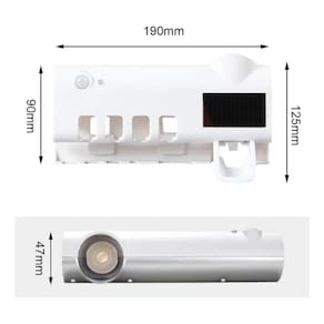 O dispenser de pasta de dente esterelizador com luz uv possui um design compacto e oco, o que garante uma boa ventilação e dificulta e proliferação de bactérias. O carregamento do dispenser por ser via cabo USB ou através da luz solar. Fácil de instalar, seu sistema de indução inteligente garante uma esterilização eficaz. Funciona da seguinte forma: quando uma pessoa se aproxima, a luz acende e o produto entra no modo de funcionamento. Se a pessoa sai, a luz apaga e a luz ultravioleta é ativada, dando início a esterilização das escovas de dente processo que dura em torno de 6 minutos . Caso uma pessoa chegue no meio do processo, a esterilização para imediatamente e o produto entra no modo de ativação novamente. O esterilizador só pode ser executado quando ninguém estiver. Para instalar o creme dental, é preciso apenas girá-lo no sentido horário. Depois de fixo, aperte o creme dental com força até o ar no dispositivo se esgotar e começar a sair.