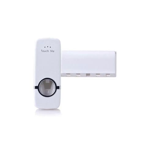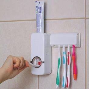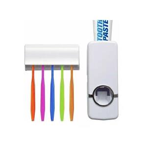 Dispenser Pasta Dente e Suporte Escovas O Dispenser para Pasta de Dente com Porta Escova Dental é um acessório prático e funcional para o banheiro, mantendo a pasta de dente organizada e facilitando sua aplicação. Com um design compacto e moderno, este conjunto oferece um dispenser automático de pasta de dente e espaço para armazenar até cinco escovas dentais, mantendo tudo limpo e acessível.