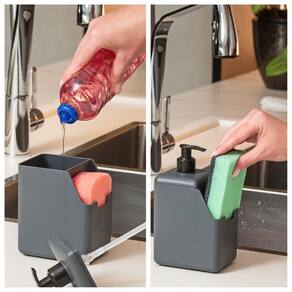 DIFERENCIAIS: Com um compartimento dedicado para a esponja, o Dispenser para Detergente Coza Single oferece uma solução completa e compacta para a organização da pia. Seu design otimiza o espaço, permitindo que ele se encaixe perfeitamente em qualquer canto, sem comprometer a funcionalidade. Prático de usar, basta pressionar o dispenser para obter a quantidade de detergente desejada, tornando a limpeza mais rápida e eficiente. Além disso, a possibilidade de armazenar a esponja junto ao detergente facilita o acesso aos utensílios de limpeza, mantendo tudo ao alcance das mãos. O bico dosador de detergente gera economia, evitando desperdícios e proporcionando uma dosagem precisa para cada limpeza.