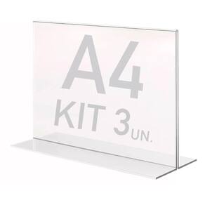 Kit 3 Displays expositor T A4 Horizontal transparente porta papel, podendo usar frente e verso (folha A4). .